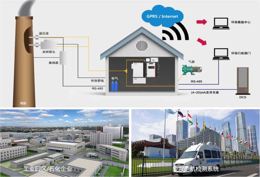 經氣樣采集輸送系統、VOCs在線分析儀、GPRS/CDMA等將數據傳送至環保部門,系統搭載自動零點校 正、數據內存、VOC濃度信號輸出、VOC濃度警報、感應異常警報等功能。